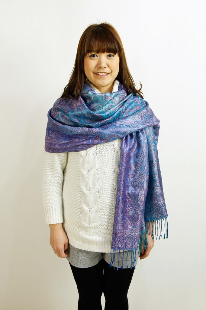 この写真ではストールのサイズは70×190cmの長方形タイプ、素材はシルクを使用しています。