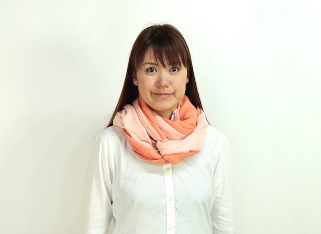 3.両端をねじるようにして2〜3回優しく交差させます。(首元はあきすぎないほうが仕上がりがきれいです)