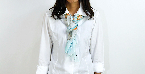 カットソーやニットならスッキリと、アウターの中に入れてもコンパクトにまとめられる巻き方です。