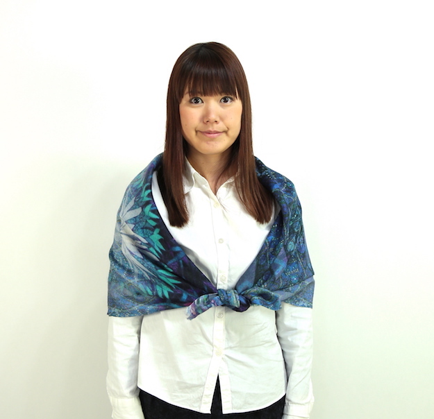 3.折り目が首元に来るように肩からさらりとかけ、左右が同じ長さになるように整えます。