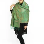 スタンダートな大判サイズで巻いても羽織っても、どちらも使いやすいタイプです。特に羽織は全体の印象がパッと華やかに、エレガントな雰囲気に変化します。