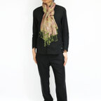 スタンダートな大判サイズで巻いても羽織っても、どちらも使いやすいタイプです。特に羽織は全体の印象がパッと華やかに、エレガントな雰囲気に変化します。