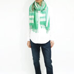 スタンダードな大判サイズで、首に巻くことはもちろん、室内でのひざ掛けにも、肩から羽織る使い方もできます。特に羽織りは、パッと華やかにエレガントな雰囲気に変わります。上半身を覆えるので、着ている服を気にせず合わせることができます。忙しい朝もコーディネートを気にする必要はありません。