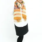 スタンダードな大判サイズで、首に巻くことはもちろん、室内でのひざ掛けにも、肩から羽織る使い方もできます。特に羽織りは、パッと華やかにエレガントな雰囲気に変わります。上半身を覆えるので、着ている服を気にせず合わせることができます。忙しい朝もコーディネートを気にする必要はありません。