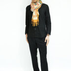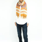 スタンダードな大判サイズで、首に巻くことはもちろん、室内でのひざ掛けにも、肩から羽織る使い方もできます。特に羽織りは、パッと華やかにエレガントな雰囲気に変わります。上半身を覆えるので、着ている服を気にせず合わせることができます。忙しい朝もコーディネートを気にする必要はありません。