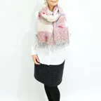 スタンダードな大判サイズで、首に巻くことはもちろん、室内でのひざ掛けにも、肩から羽織る使い方もできます。特に羽織りは、パッと華やかにエレガントな雰囲気に変わります。上半身を覆えるので、着ている服を気にせず合わせることができます。忙しい朝もコーディネートを気にする必要はありません。