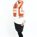 スタンダードな大判サイズで、首に巻くことはもちろん、室内でのひざ掛けにも、肩から羽織る使い方もできます。特に羽織りは、パッと華やかにエレガントな雰囲気に変わります。上半身を覆えるので、着ている服を気にせず合わせることができます。忙しい朝もコーディネートを気にする必要はありません。