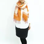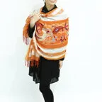 スタンダードな大判サイズで、首に巻くことはもちろん、室内でのひざ掛けにも、肩から羽織る使い方もできます。特に羽織りは、パッと華やかにエレガントな雰囲気に変わります。上半身を覆えるので、着ている服を気にせず合わせることができます。忙しい朝もコーディネートを気にする必要はありません。