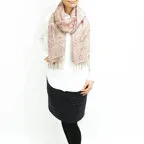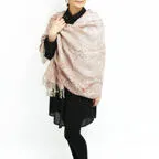スタンダードな大判サイズで、首に巻くことはもちろん、室内でのひざ掛けにも、肩から羽織る使い方もできます。特に羽織りは、パッと華やかにエレガントな雰囲気に変わります。上半身を覆えるので、着ている服を気にせず合わせることができます。忙しい朝もコーディネートを気にする必要はありません。