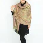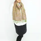 スタンダートな大判サイズで巻いても羽織っても、どちらも使いやすいタイプです。特に羽織は全体の印象がパッと華やかに、エレガントな雰囲気に変化します。