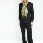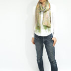 スタンダートな大判サイズで巻いても羽織っても、どちらも使いやすいタイプです。特に羽織は全体の印象がパッと華やかに、エレガントな雰囲気に変化します。