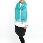 スタンダートな大判サイズで巻いても羽織っても、どちらも使いやすいタイプです。特に羽織は全体の印象がパッと華やかに、エレガントな雰囲気に変化します。