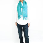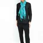 スタンダートな大判サイズで巻いても羽織っても、どちらも使いやすいタイプです。特に羽織は全体の印象がパッと華やかに、エレガントな雰囲気に変化します。