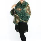 非常に大きなショールサイズで、広げて羽織れば上半身をすっぽりと覆うことができます。縦横の長さも十分にあるため、巻き方の自由度が広がります。程よいボリューム感と立体感を簡単につくることができるため、一巻きでこなれた印象になります。面積もあるので、真夏の室内での冷房対策や膝掛けとしても使いやすくなっています。