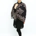 スタンダードな大判サイズで、首に巻くことはもちろん、室内でのひざ掛けにも、肩から羽織る使い方もできます。特に羽織りは、パッと華やかにエレガントな雰囲気に変わります。上半身を覆えるので、着ている服を気にせず合わせることができます。忙しい朝もコーディネートを気にする必要はありません。