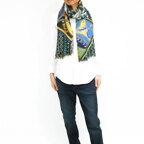 非常に大きなショールサイズで、広げて羽織れば上半身をすっぽりと覆うことができます。縦横の長さも十分にあるため、巻き方の自由度が広がります。程よいボリューム感と立体感を簡単につくることができるため、一巻きでこなれた印象になります。面積もあるので、真夏の室内での冷房対策や膝掛けとしても使いやすくなっています。