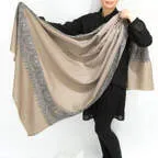 このカシミアストールには最も繊細なインドカシミール地方ラダック産カシミア糸(パシュミナ)が使われています。そのため手織りカシミアストールの中でも最も目が細く繊細な生地となっています。薄くて軽くてやわらかい最上級の一枚です。