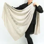 195cm×100cm大判ショールサイズで、巻きでも羽織でもどちらも使いやすいストールです。特に羽織は全面に施された刺繍が美しく輝き、サッとあしらうだけでゴージャスな雰囲気に変化します。横幅が特に長いのでドレスや着物などの羽織物としても重宝します。
