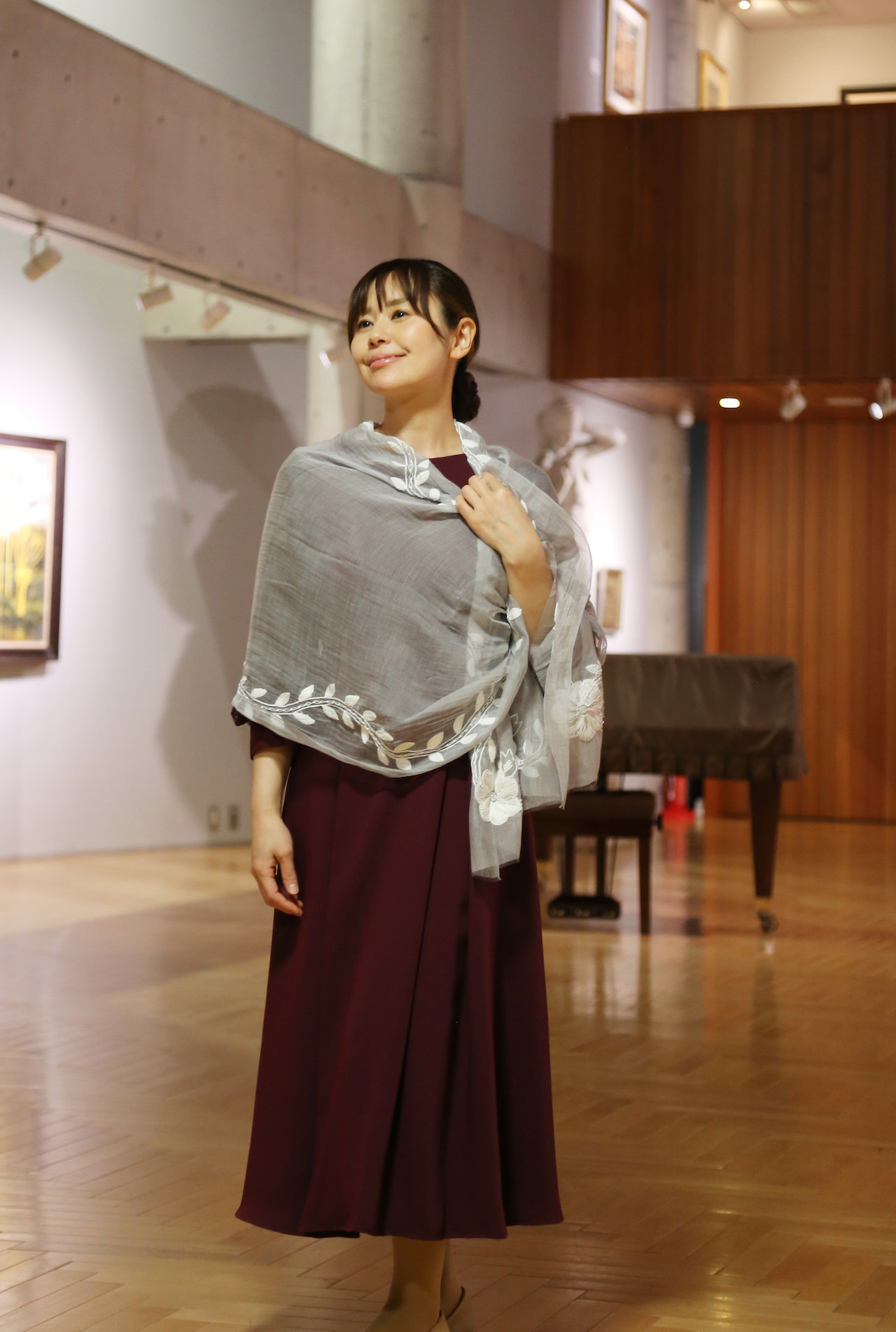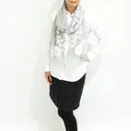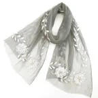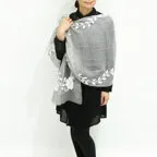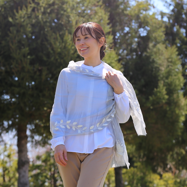 スタンダードな大判サイズと軽やかな質感で、巻きだけでなく羽織でも合わせやすいタイプです。トップスがほのかに透けて見え、上品な印象を与えてくれます。