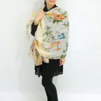 大判サイズのストールで肩から羽織る使い方もできます。春夏の日除けや室内の冷房対策としても使いやすくなっています。