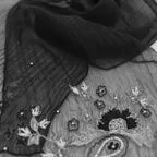さらに木製のブロックプリントを用い、生地に下書きのデザインを写し、その上から複数の職人によって手刺繍が施されています。右手で鉤針を操り、左手で刺繍糸を扱い、一針一針丁寧にビーズ・パールを施し、繊細で美しいデザインを作り上げていきます。