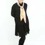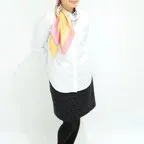 スクエアサイズで、アスコットタイのようにシャツやブラウスの中におさめて使うこともできます。室内でも巻いたままでいられるので使いやすくなっています。