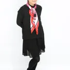 スクエアサイズで、アスコットタイのようにシャツやブラウスの中におさめて使うこともできます。室内でも巻いたままでいられるので使いやすくなっています。