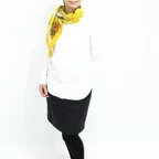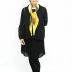 スクエアサイズで、アスコットタイのようにシャツやブラウスの中におさめて使うこともできます。室内でも巻いたままでいられるので使いやすくなっています。