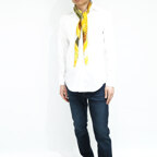 スクエアサイズで、アスコットタイのようにシャツやブラウスの中におさめて使うこともできます。室内でも巻いたままでいられるので使いやすくなっています。