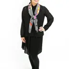 スクエアサイズで、アスコットタイのようにシャツやブラウスの中におさめて使うこともできます。室内でも巻いたままでいられるので使いやすくなっています。