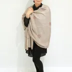 バランスの良い大判サイズで、巻きでも羽織でもどちらも使いやすいストールです。特に羽織は全面に施された刺繍が美しく輝き、サッとあしらうだけでゴージャスな雰囲気に変化します。