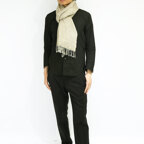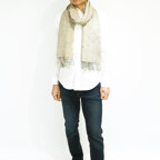 スタンダードな大判サイズで、首に巻くことはもちろん、室内でのひざ掛けにも、肩から羽織る使い方もできます。特に羽織りは、パッと華やかにエレガントな雰囲気に変わります。上半身を覆えるので、着ている服を気にせず合わせることができます。忙しい朝もコーディネートを気にする必要はありません。