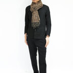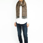 スタンダードな大判サイズで、首に巻くことはもちろん、室内でのひざ掛けにも、肩から羽織る使い方もできます。特に羽織りは、パッと華やかにエレガントな雰囲気に変わります。上半身を覆えるので、着ている服を気にせず合わせることができます。忙しい朝もコーディネートを気にする必要はありません。