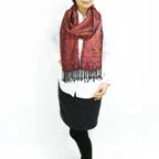 スタンダートな大判サイズで巻いても羽織っても、どちらも使いやすいタイプです。特に羽織は全体の印象がパッと華やかに、エレガントな雰囲気に変化します。