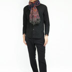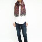 スタンダードな大判サイズで、首に巻くことはもちろん、室内でのひざ掛けにも、肩から羽織る使い方もできます。特に羽織りは、パッと華やかにエレガントな雰囲気に変わります。上半身を覆えるので、着ている服を気にせず合わせることができます。忙しい朝もコーディネートを気にする必要はありません。
