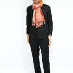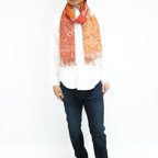 スタンダードな大判サイズで、首に巻くことはもちろん、室内でのひざ掛けにも、肩から羽織る使い方もできます。特に羽織りは、パッと華やかにエレガントな雰囲気に変わります。上半身を覆えるので、着ている服を気にせず合わせることができます。忙しい朝もコーディネートを気にする必要はありません。