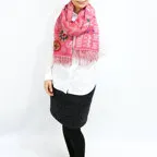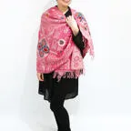 スタンダードな大判サイズで、首に巻くことはもちろん、室内でのひざ掛けにも、肩から羽織る使い方もできます。特に羽織りは、パッと華やかにエレガントな雰囲気に変わります。上半身を覆えるので、着ている服を気にせず合わせることができます。忙しい朝もコーディネートを気にする必要はありません。