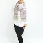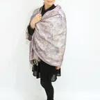 スタンダートな大判サイズで巻いても羽織っても、どちらも使いやすいタイプです。特に羽織は全体の印象がパッと華やかに、エレガントな雰囲気に変化します。