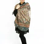 非常に大きなショールサイズで、広げて羽織れば上半身をすっぽりと覆うことができます。縦横の長さも十分にあるため、巻き方の自由度が広がります。程よいボリューム感と立体感を簡単につくることができるため、一巻きでこなれた印象になります。面積もあるので、真夏の室内での冷房対策や膝掛けとしても使いやすくなっています。