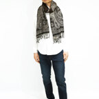 スタンダードな大判サイズで、首に巻くことはもちろん、室内でのひざ掛けにも、肩から羽織る使い方もできます。特に羽織りは、パッと華やかにエレガントな雰囲気に変わります。上半身を覆えるので、着ている服を気にせず合わせることができます。忙しい朝もコーディネートを気にする必要はありません。