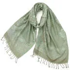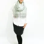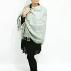 スタンダードな大判サイズで、首に巻くことはもちろん、室内でのひざ掛けにも、肩から羽織る使い方もできます。特に羽織りは、パッと華やかにエレガントな雰囲気に変わります。上半身を覆えるので、着ている服を気にせず合わせることができます。忙しい朝もコーディネートを気にする必要はありません。