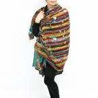 非常に大きなショールサイズで、広げて羽織れば上半身をすっぽりと覆うことができます。縦横の長さも十分にあるため、巻き方の自由度が広がります。程よいボリューム感と立体感を簡単につくることができるため、一巻きでこなれた印象になります。面積もあるので、真夏の室内での冷房対策や膝掛けとしても使いやすくなっています。