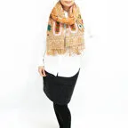スタンダードな大判サイズで、首に巻くことはもちろん、室内でのひざ掛けにも、肩から羽織る使い方もできます。特に羽織りは、パッと華やかにエレガントな雰囲気に変わります。上半身を覆えるので、着ている服を気にせず合わせることができます。忙しい朝もコーディネートを気にする必要はありません。