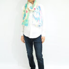 大判サイズのストールで肩から羽織る使い方もできます。春夏の日除けや室内の冷房対策としても使いやすくなっています。