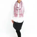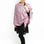 スタンダートな大判サイズで巻いても羽織っても、どちらも使いやすいタイプです。特に羽織は全体の印象がパッと華やかに、エレガントな雰囲気に変化します。