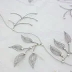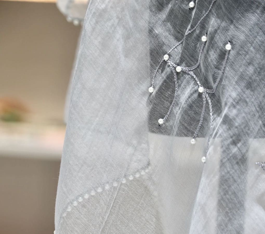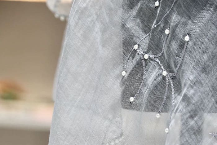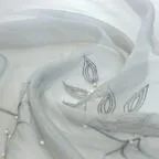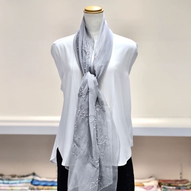 落ち着いたパールグレイベースの生地にパールグレイとオフホワイトの刺繍&ビーズをあしらったデザイン。 合わせやすさとアクセント効果のバランスが絶妙な一枚に仕上がっています。