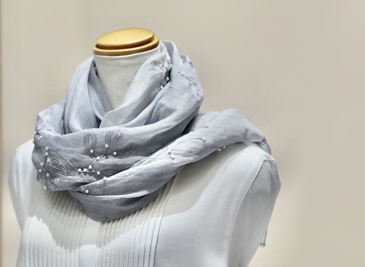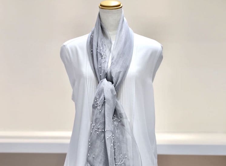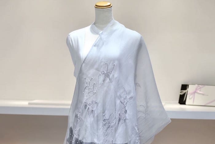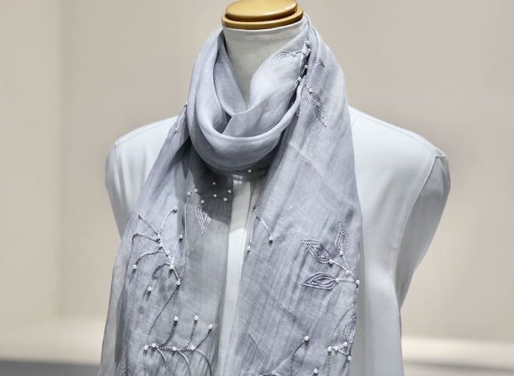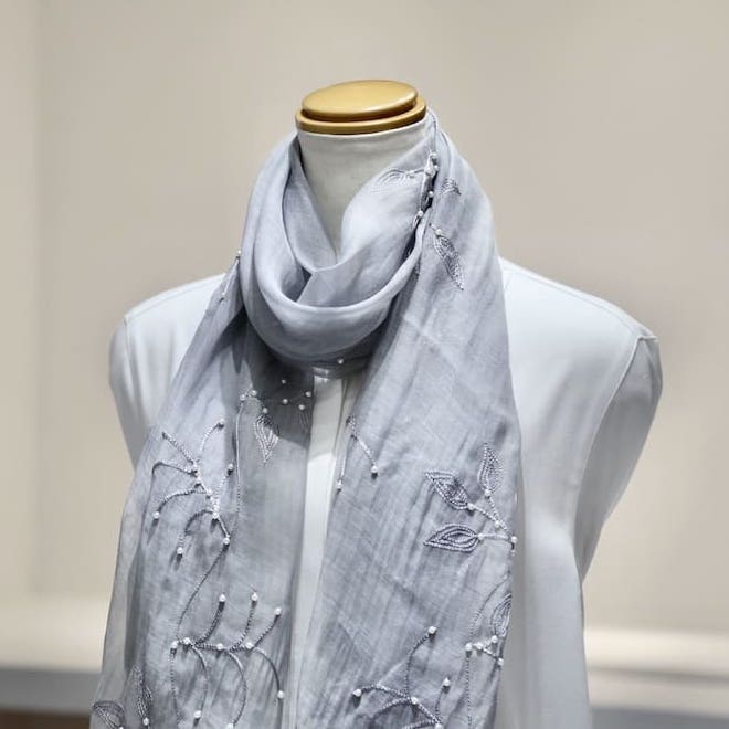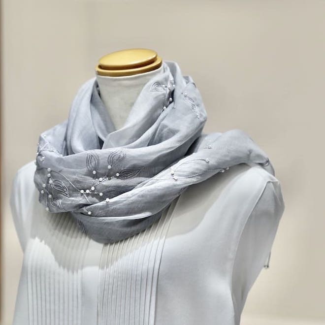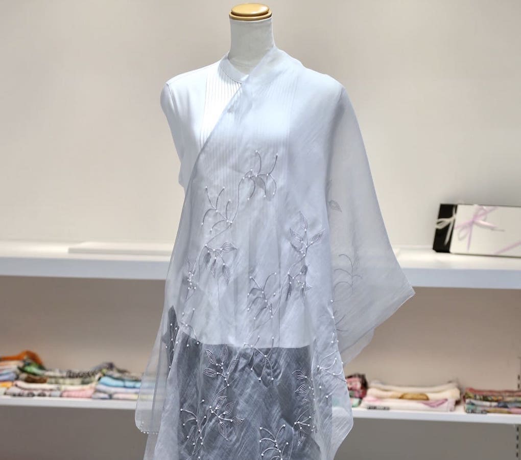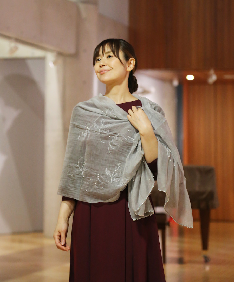 バランス良いミドルサイズで巻きでも羽織でもどちらでも使いやすくなっています。 特に羽織はトップスがほのかに透け、刺繍部のデザインが浮き上がることで非常に上品な印象になります。