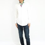 68cm×68cmの小判スカーフで、アスコットタイのようにシャツやブラウスの中におさめて使うこともできます。室内でも巻いたままでいられるので使いやすくなっています。