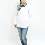 65cm×65cmの小判スカーフで、アスコットタイのようにシャツやブラウスの中におさめて使うこともできます。室内でも巻いたままでいられるので使いやすくなっています。