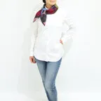 65cm×65cmの小判スカーフで、アスコットタイのようにシャツやブラウスの中におさめて使うこともできます。室内でも巻いたままでいられるので使いやすくなっています。